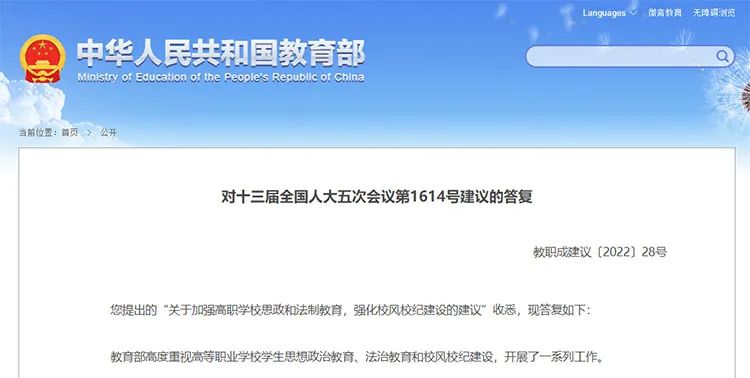 《答复函》指出,教育部高度重视高等职业学校学生思想政治教育、法治教育和校风校纪建设,开展了一系列工作。